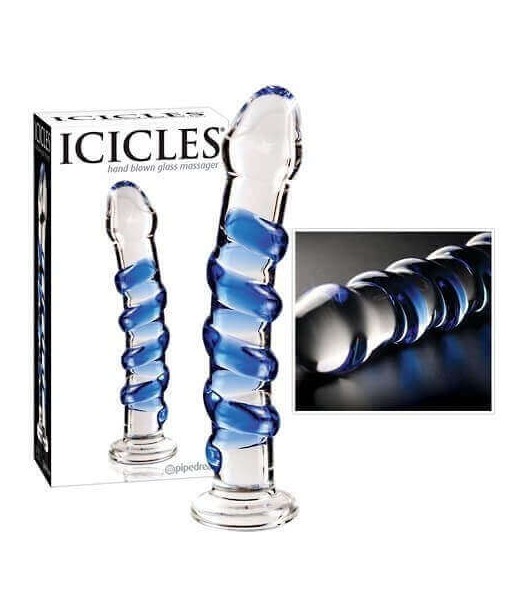 Fallo trasparente in vetro con la linea blu avvolta in tutto il corpo per aumentare la stimolazione vaginale! Raffreddare in frigorifero o riscaldare con acqua calda.