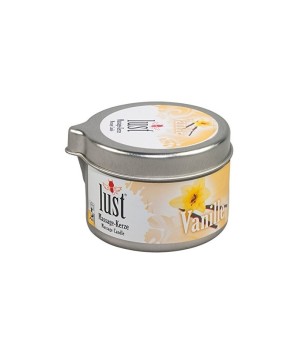 Candela per massaggio al profuma di vaniglia in una scatola decorativa, ricca di olio di cocco e aloe vera.