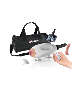 Macchina del sesso (40 cm di lunghezza, 15 cm di larghezza) con: Guaina Fanta Flesh vagina, Dildo King Cock color pelle chiaro da 16 cm di lunghezza e 4,1 cm di diametro, Dildo King Cock da 20,5 cm di lunghezza e 4,1 cm di diametro, Telecomando senza fili, Adattatore di corrente universale, Supporto per tablet o smartphone, Borsa di conservazione (da viaggio)