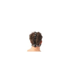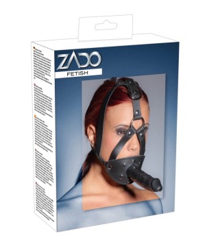 Sull'imbracatura regolabile nera c'è un bavaglio rosso (Ø 3,5 cm) all'interno e un magnifico dildo (13 cm di lunghezza, Ø 3,5 cm) all'esterno. Materiale: pelle crosta (pelle bovina), TPE, lattice.